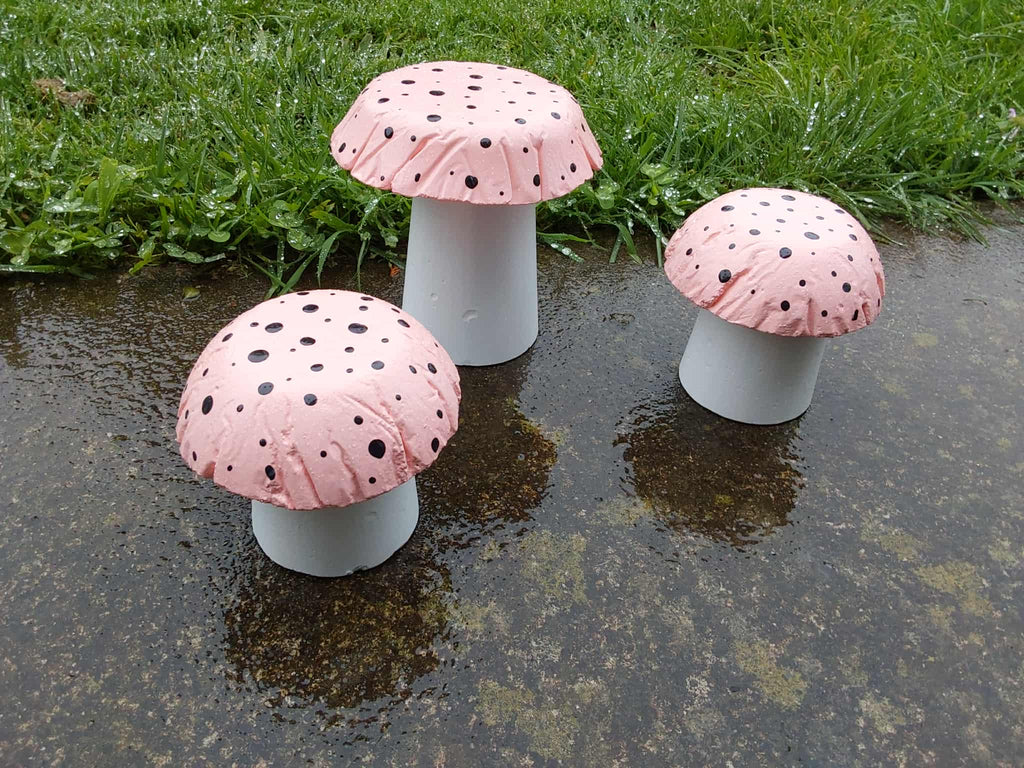 Handmade concrete mushrooms, painted and varnished with a concrete sealer.