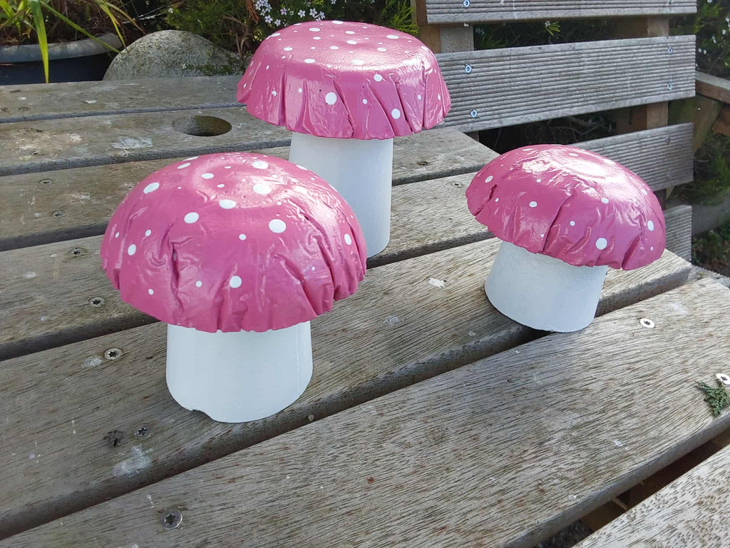 Handmade concrete mushrooms, painted and varnished with a concrete sealer.