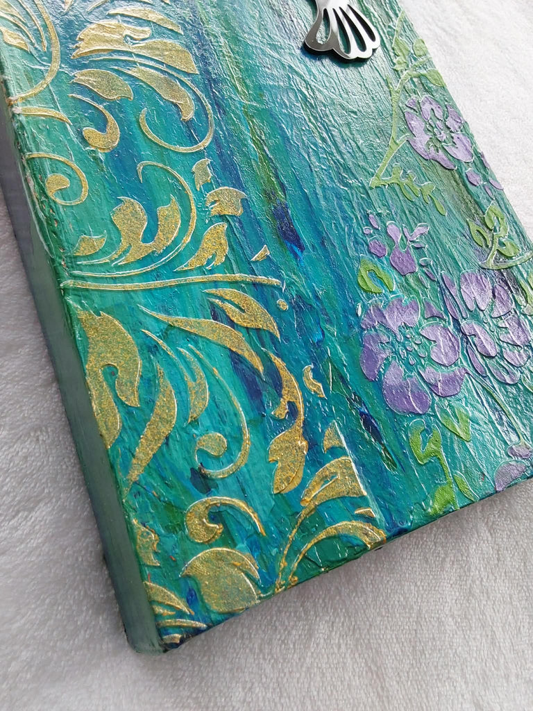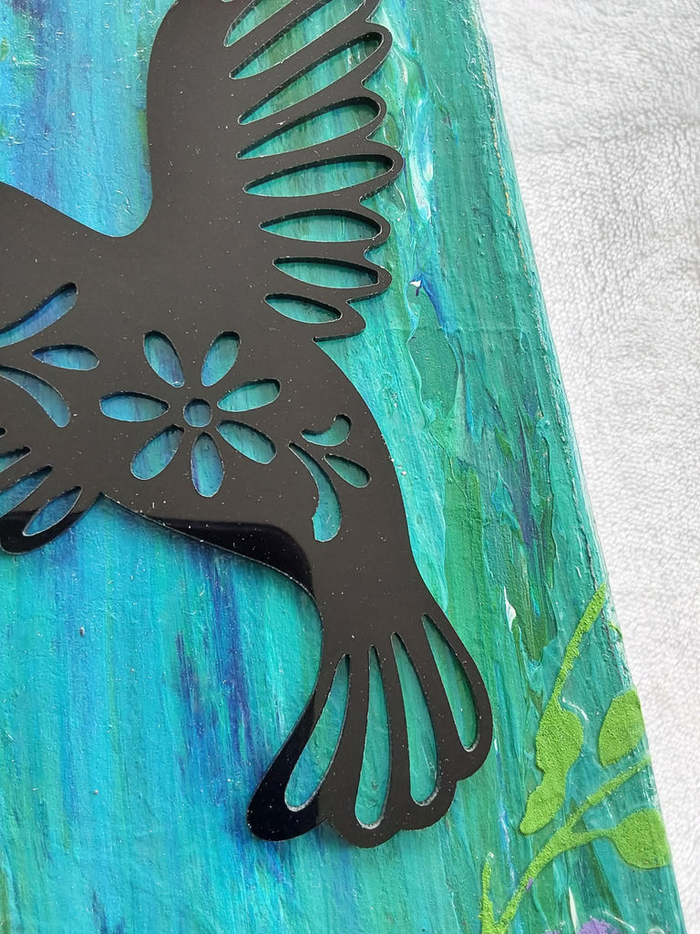 Mixed media hummingbird canvas with layers of texture, metal hummingbird, acrylic paints and sealed with a gloss varnish.