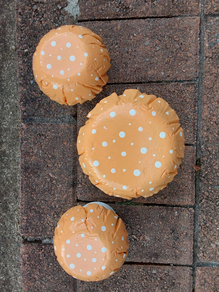 Handmade concrete mushrooms, painted and varnished with a concrete sealer.